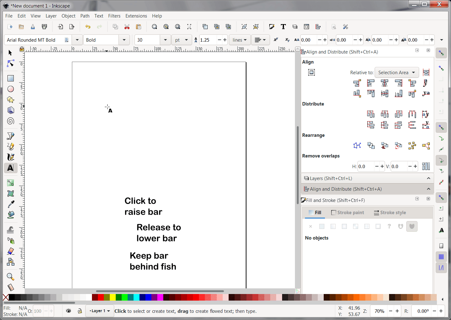 The “Create and edit text objects” or text tool (hotkey: T) can be used to layout text in Inkscape. I want to use a custom font (Arial Rounded or Seurat) which means I can’t use the built-in text tool in Scratch since it doesn’t have either of those fonts. To use the text tool in Inkscape: